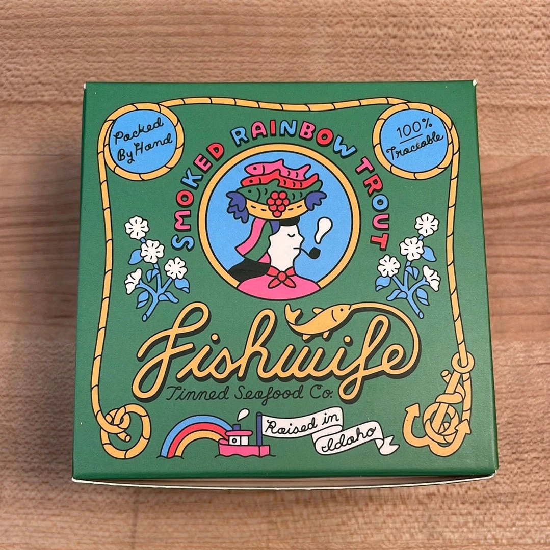 The trout is brined in extra-virgin olive oil, salt, garlic, and brown sugar, and smoked in small batches over alder wood, hand-packed, and canned by a family-owned cannery on the coast of Oregon.