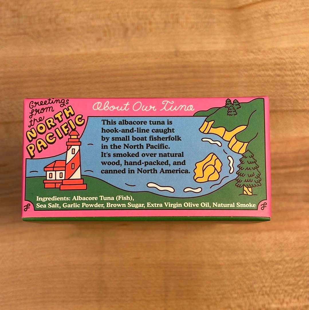 Ingredients: Wild-Caught Albacore Tuna, Extra Virgin Olive Oil, Garlic Salt, Brown Sugar, Alder Smoke