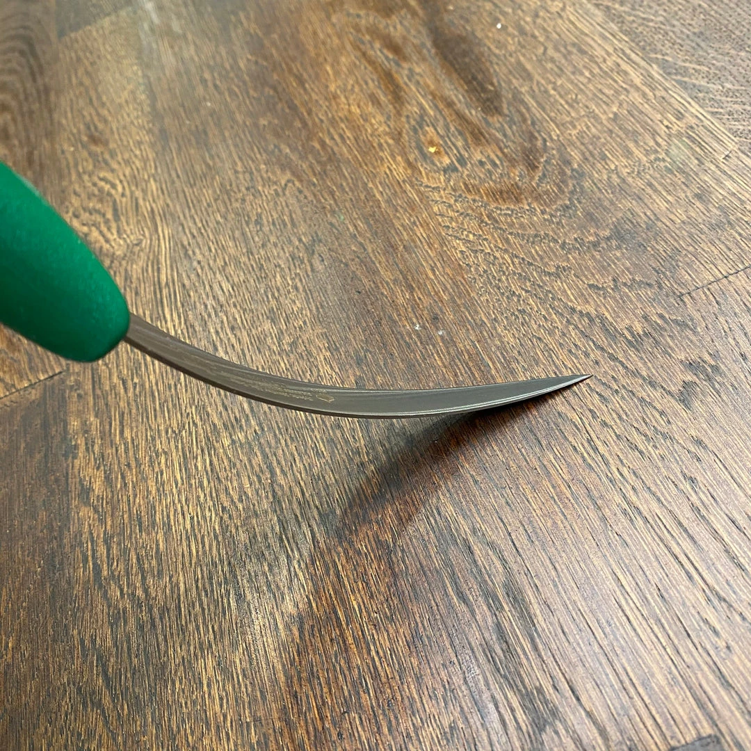 5″ stainless steel flex curved blade boning knife with green plastic ergonomic handle from the Pikas-Don Carlos line.