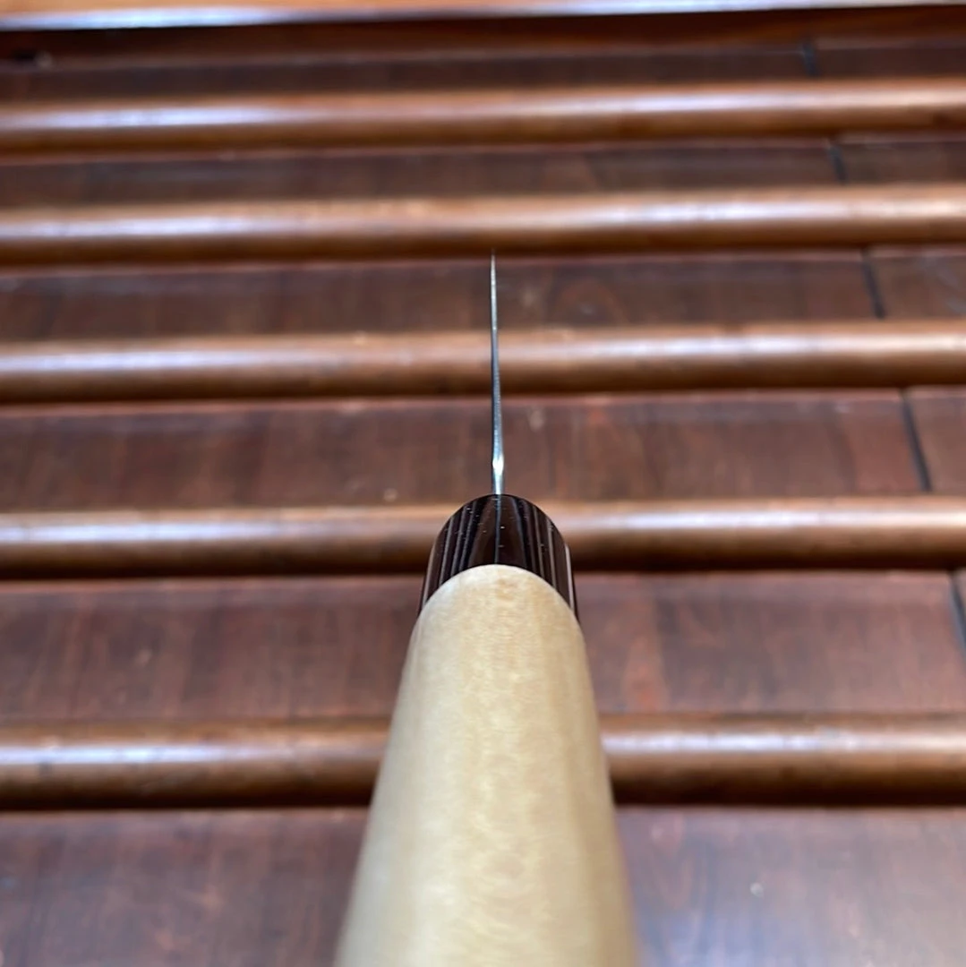 This steel has an excellent blend of edge holding, sharpenability, edge formation, toughness and stainless properties. The handle work is very nice with a great fit and finish; smoothed heel and spine as well as convexity on the blade face for smooth cutting and good release.