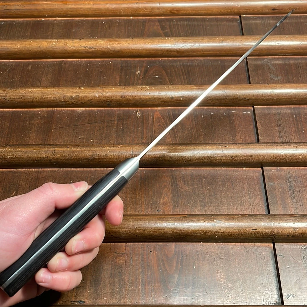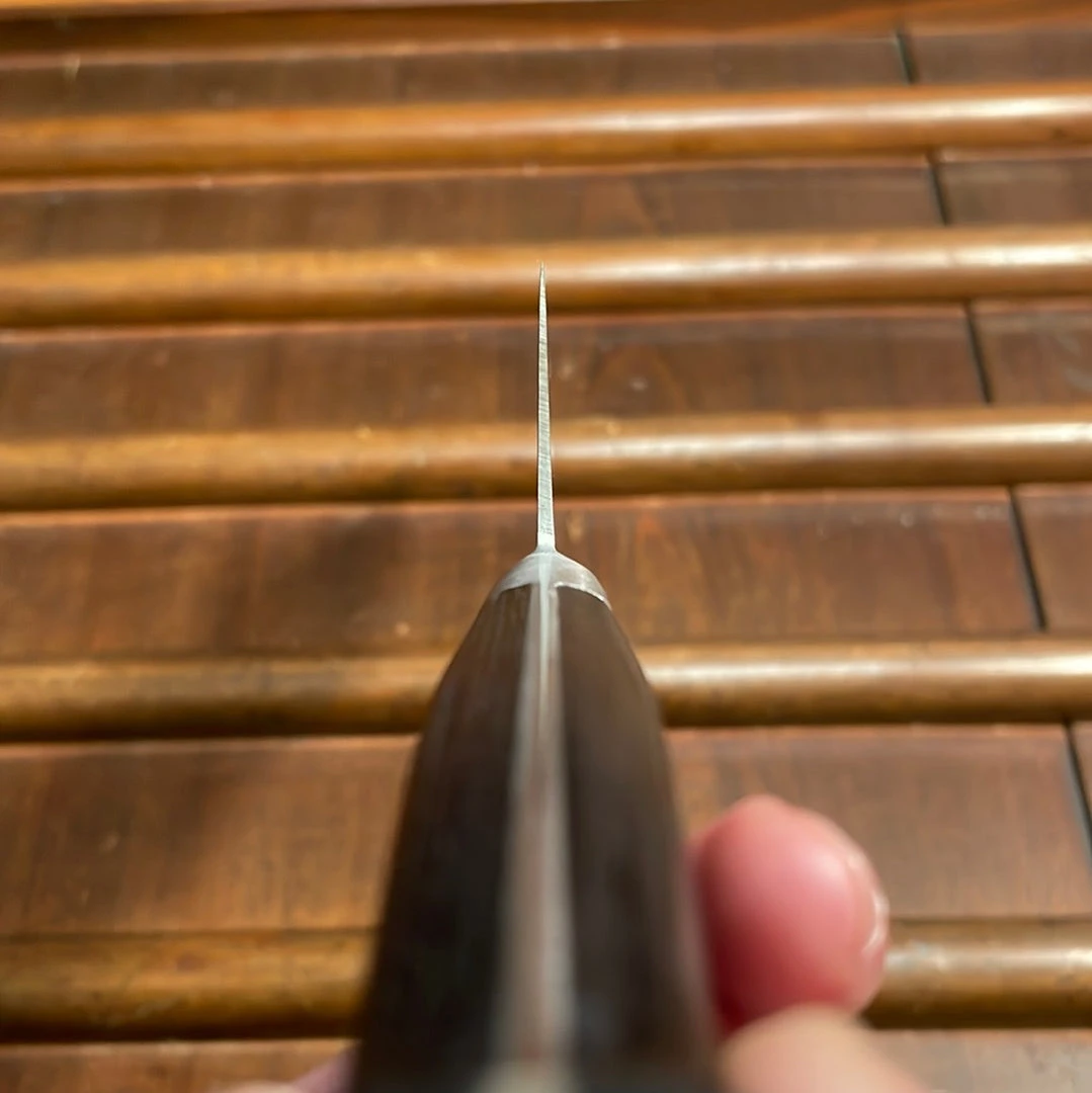 Old style forged carbon steel Kanto gyuto. These represent the original gyuto style whose design remained relatively unchanged for decades. We are big fans of thin carbon steel gyuto like this, they cut smoothly, sharpen easily and are not terribly delicate if a few basic rules are followed.