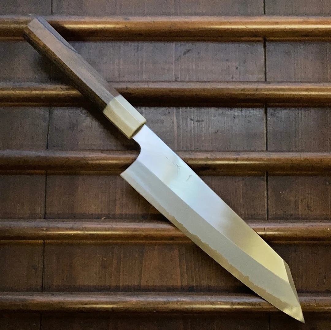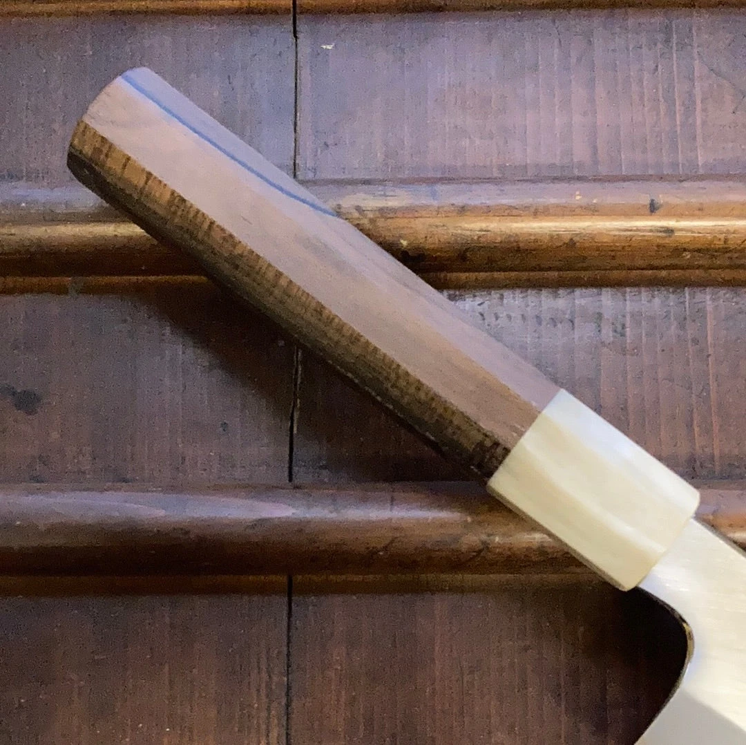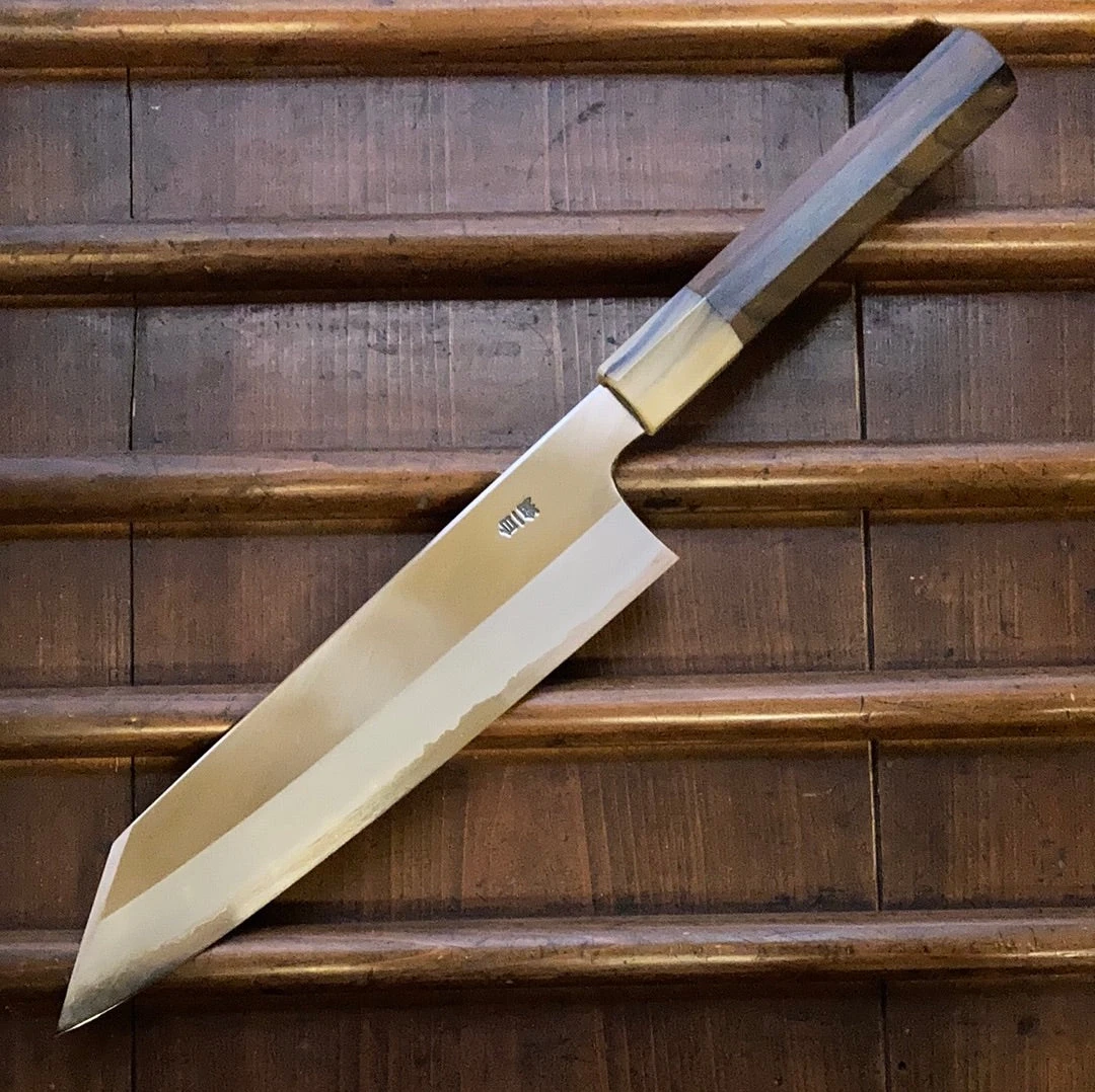 Hand made in Sakai, stainless clad shirogami 1 forged by dentoukougeishi master smith Kenji Togashi and expertly ground by his son. Stainless clad shirogami 1 is a less common combination as it is more challenging to work but it offers a great combination of the shirogami 1 carbon steel’s fine edge formation and long edge life with the stainless steel’s ease of use.