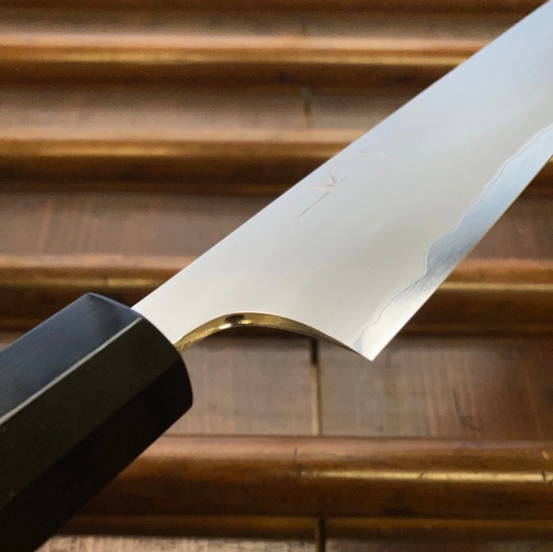 Hand made in Sakai, kasumi finish stainless clad shirogami 1 forged by dentoukougeishi master smith Kenji Togashi and expertly ground by his son. Stainless clad shirogami 1 is a less common combination as it is more challenging to work but it offers a great combination of the shirogami 1 carbon steel’s fine edge formation and long edge life with the stainless steel’s ease of use.