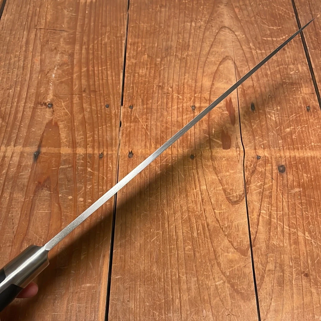 K Sabatier ‘Authentique’ series 12″ chef knife. XC75 carbon steel blade with riveted olive wood handle.