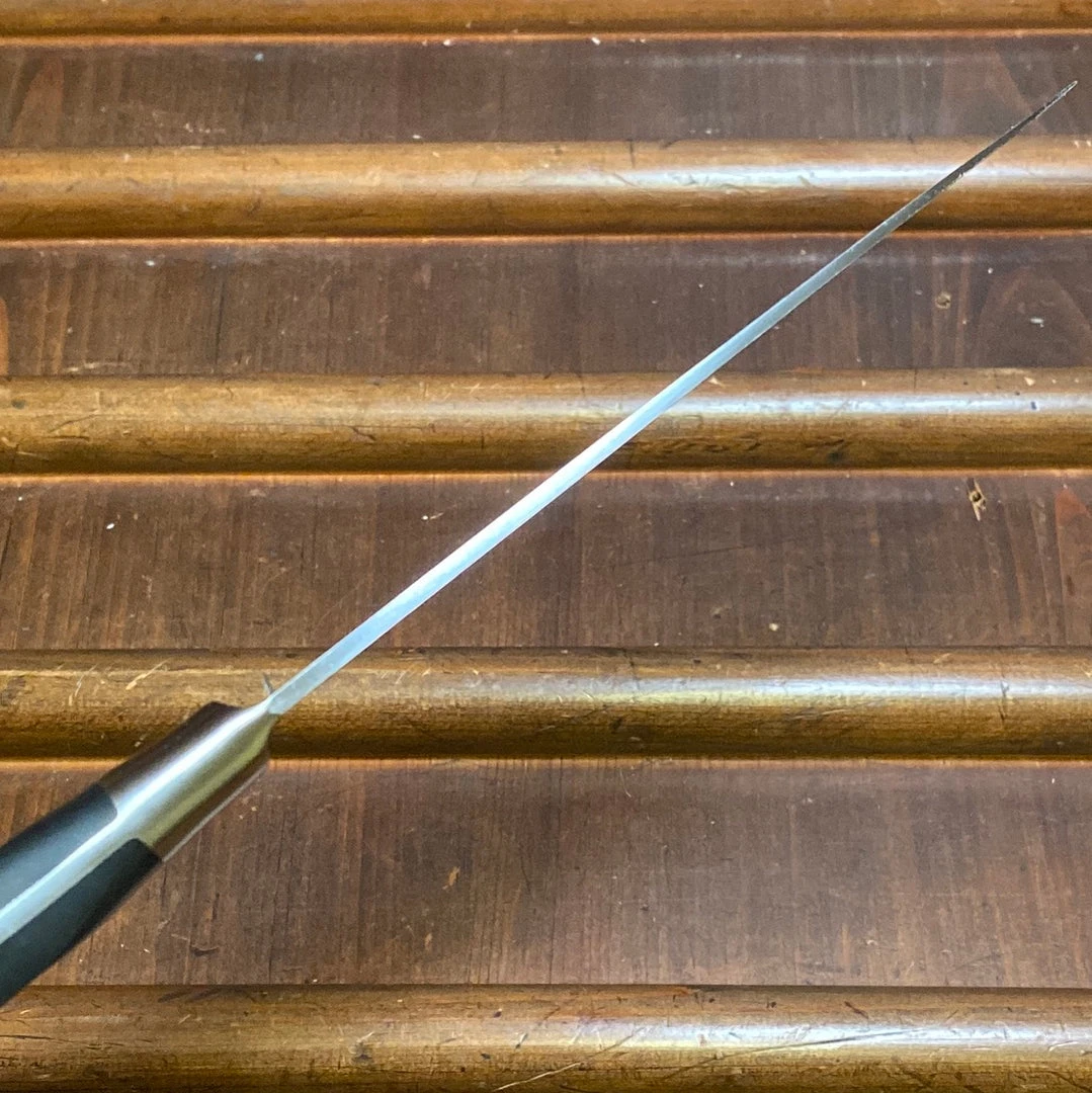 K Sabatierโs โAuthentique series carbon knives are drop forged from a single piece of XC75 and tempered to 54-56 HRC. They are ground extra thin behind the edge for awesome cutting feel, are easy to sharpen and have good toughness, a great all around workhorse. Carbon steel will develop a patina, and rust if left wet. Dry immediately after use, never soak or put in the dishwasher. Rust can be removed with a light abrasive.