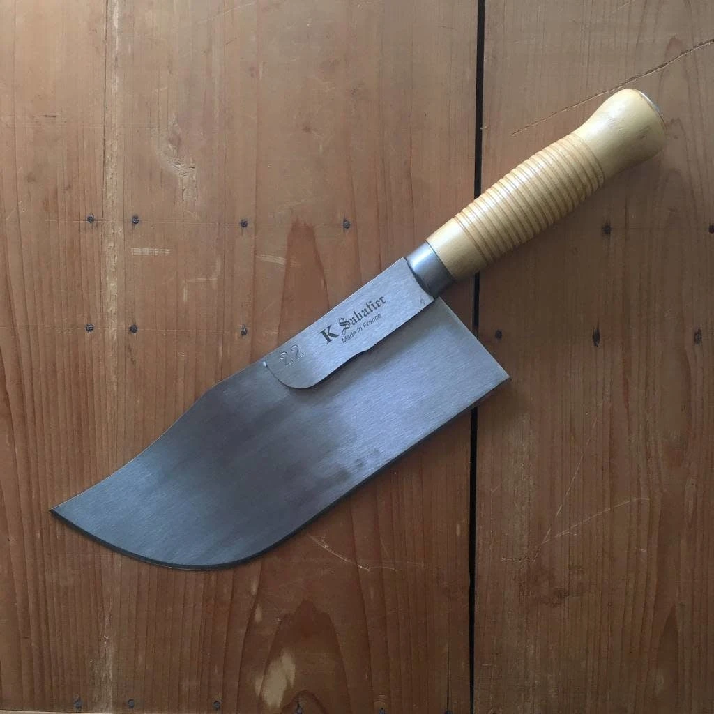 K Sabatier 10″ butcher’s leaf cleaver. Carbon steel blade with a turned boxwood handle.