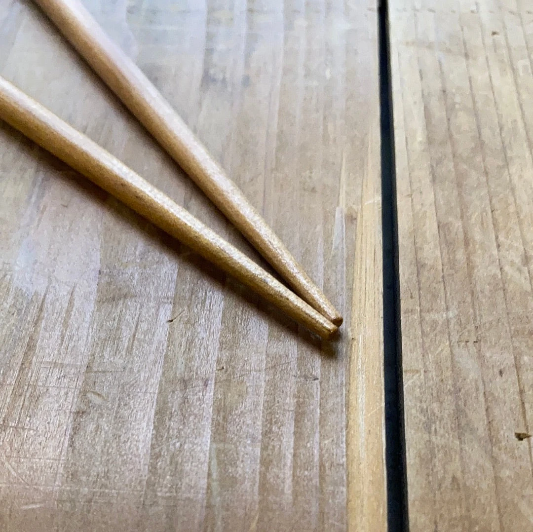 Wooden cooking chopsticks with square shape and threaded wrapping.