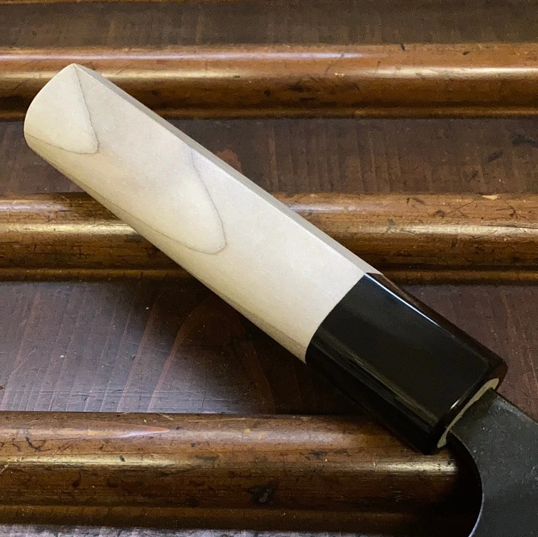 Ishikawa-san’s knives have a distinctive Sanjo accent with their thick spines and generous proportions. Bei-san’s work is very consistent, evenly forge drawn thin blades and clean grinds. Dare we call his shirogami 2 a poor man’s Shigefusa?