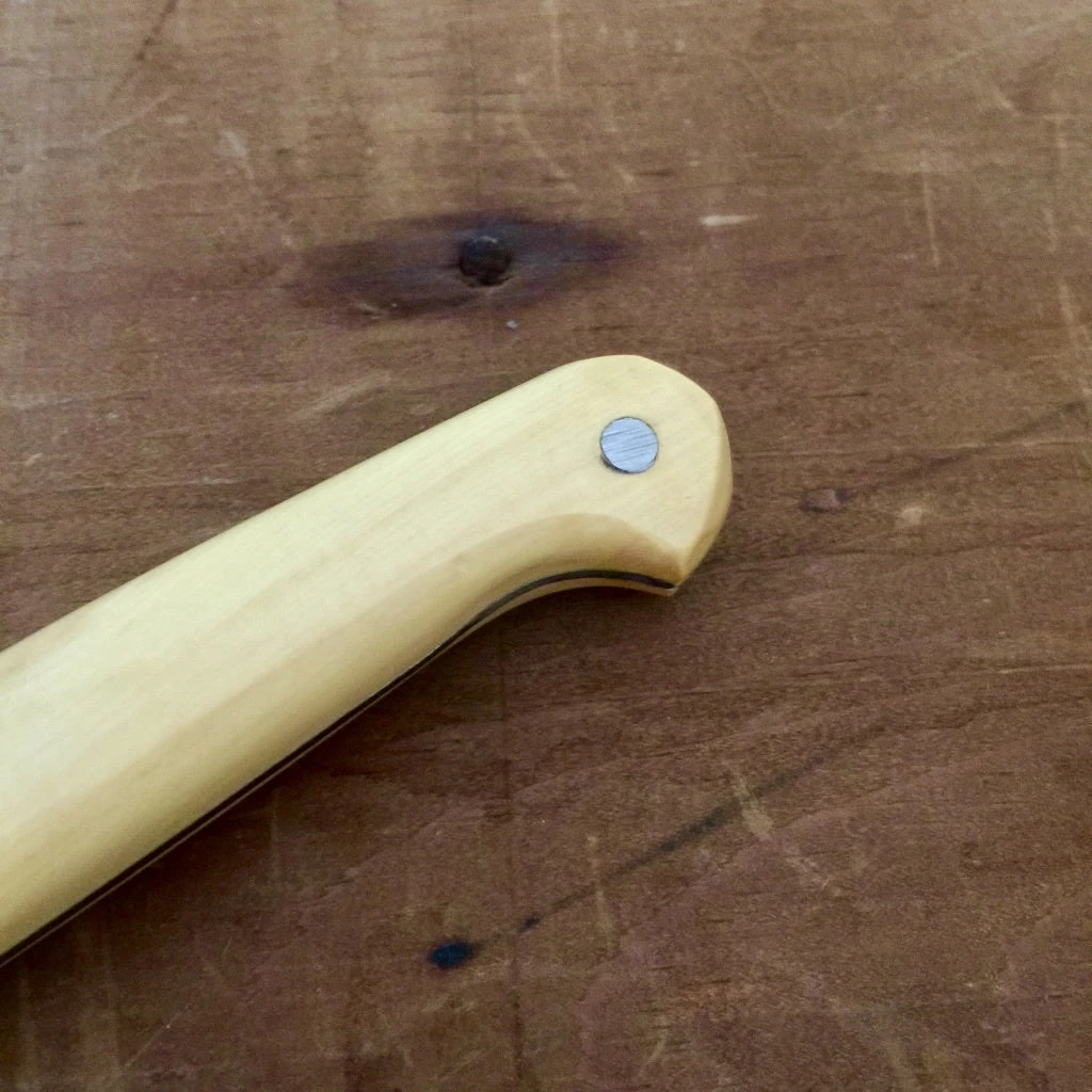 Pallares 3.5″ slim table and steak knife. Stainless steel leaf shaped blades and steel pinned boxwood handles. Equally appropriate in both a rustic and refined table setting.